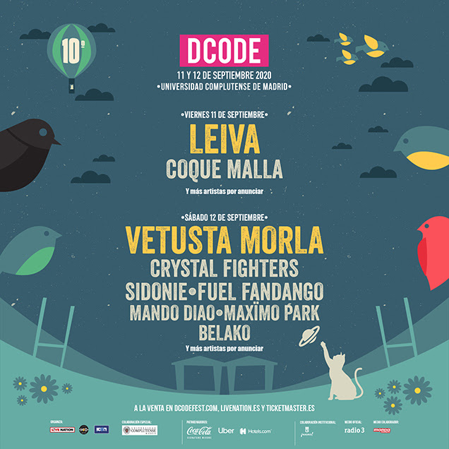 La décima edición del festival Dcode se celebra en la Universidad Complutense de Madrid los días 11 y 12 de septiembre. Leiva y Vetusta Morla serán los cabezas de cartel y repasarán sus respectivos repertorios con shows completo. Además el concierto de Vetusta Morla será el último hasta nuevo aviso. Crystal Fighters, Sidonie, Coque Malla, Mando Diao, Maxïmo Park, Fuel Fandango y Belako también se darán cita en el Complejo Deportivo de Cantarranas.